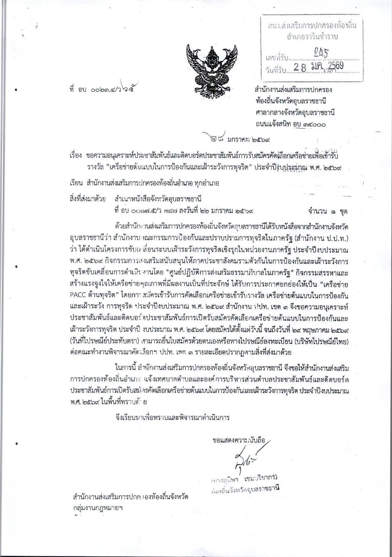 แจ้งประชาสัมพันธ์ การรับสมัครคัดเลือกเครือข่ายเพื่อเข้ารับรางวัล เครือข่ายต้นแบบในการป้องกันแล่ะเฝ้าระวังการทุจริต ประจำปีงบประมาณ 2569