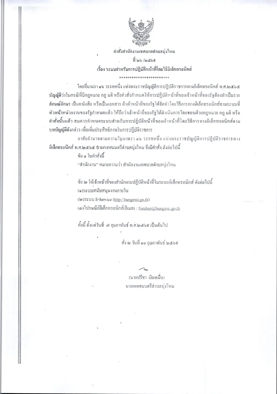 คำสั่ง สำนักงานเทศบาลตำบลบุ่งไหม เรื่อง ระบบสำหรับปฏิบัติหน้าที่โดยวิธีทางอิเล็กทรอนิกส์