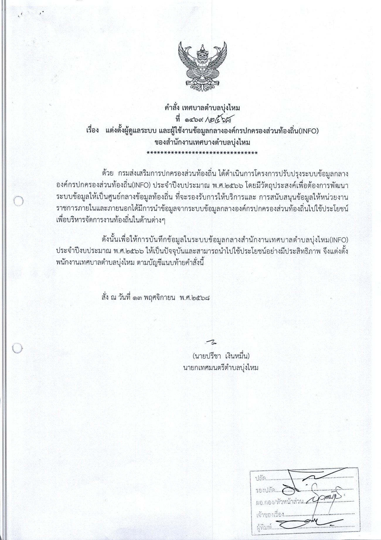บันทึก แจ้งคำสั่งแต่งตั้ง ผู้รับผิดขอบในการบันทึกปรับปรุงและรับรองข้อมูลกลางองค์กรปกครองส่วนท้องถิ่น ของเทศบาลตำบลบุ่งไหม
