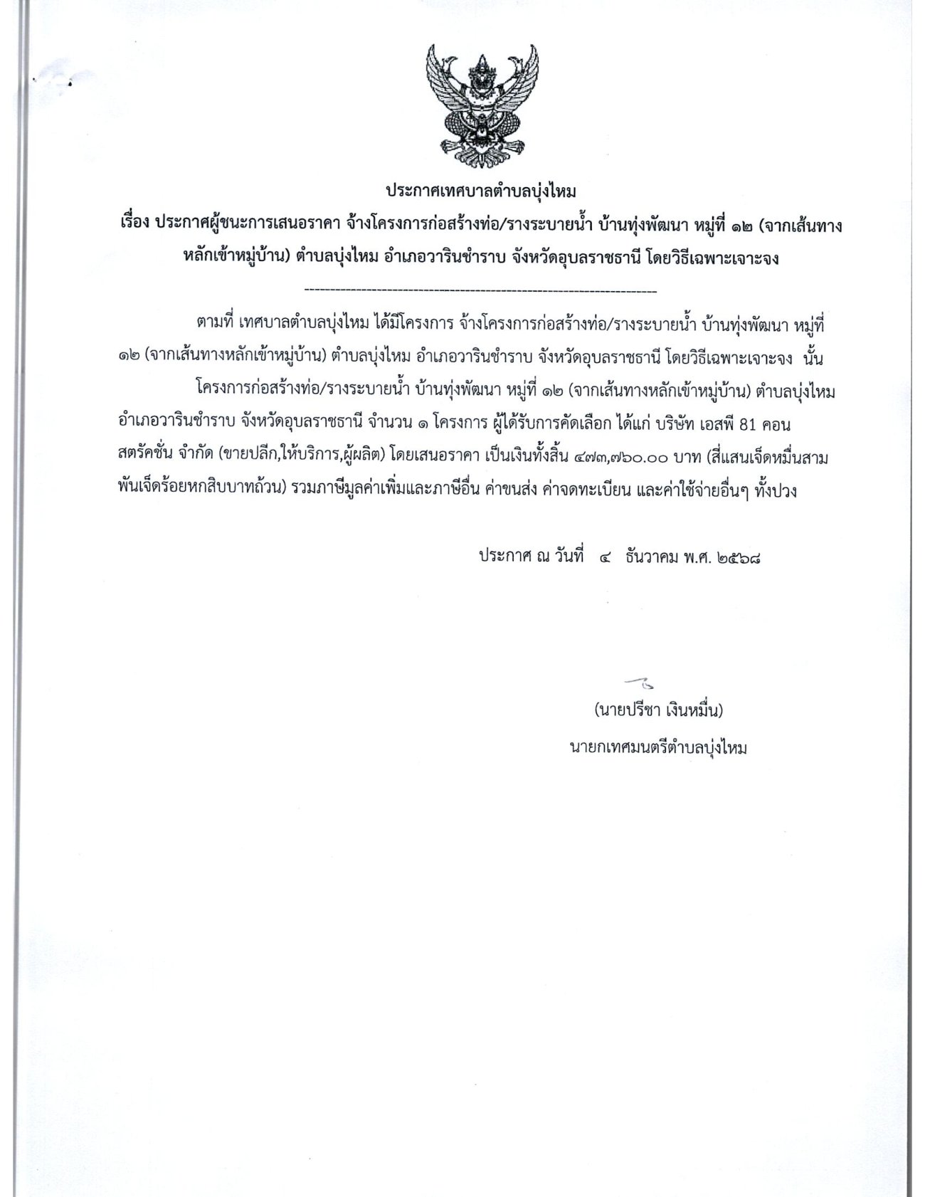 ประกาศผู้ชนะการเสนอราคา โครงการก่อสร้างท่อระบายน้ำ/รางระบายน้ำ บ้านทุ่งพัฒนา ม.12(จากเส้นทางหลักเข้าหมู่บ้าน)